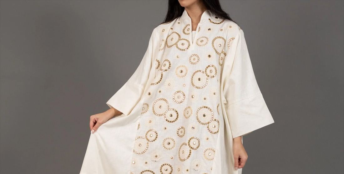 قفطان باللون الأوف وايت مع تطريزات ذهبية أنيقة – السعر 1,039.77 ريال سعودي