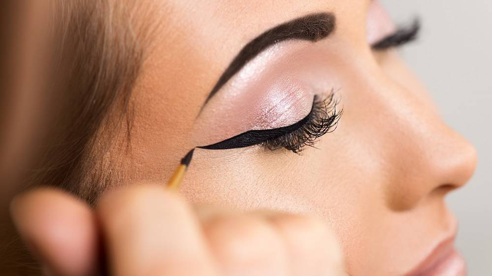 قومي برسم الآيلاينر المسحوب باللون الأسود، طبقي المستحضر على كامل خط الرموش العلوي مع الحرص على أن يكون بارز على الجفن العلوي واسحبيه لخارج العين بشكل مائل للأعلى.